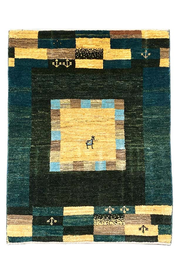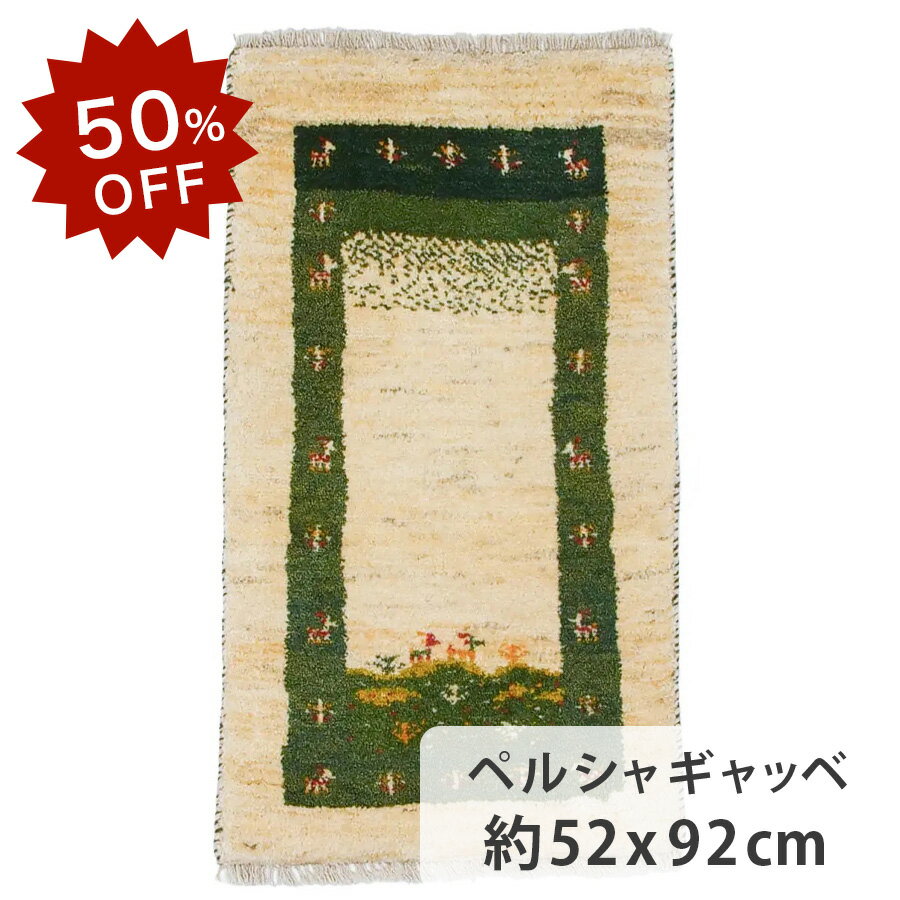 【50%OFF!楽天スーパーSALE限定!】ペルシャギャッベ 約52cm x 92cm 玄関サイズ ウール100% 羊毛 ナチュラル ベージュ グリーン 緑色 天然 ふかふか モコモコ 厚手 四角 動物 鹿 ホットカーペット対応 床暖房対応 オールシーズン 現品限り ペルシャ製 春 夏 秋 冬 手織り