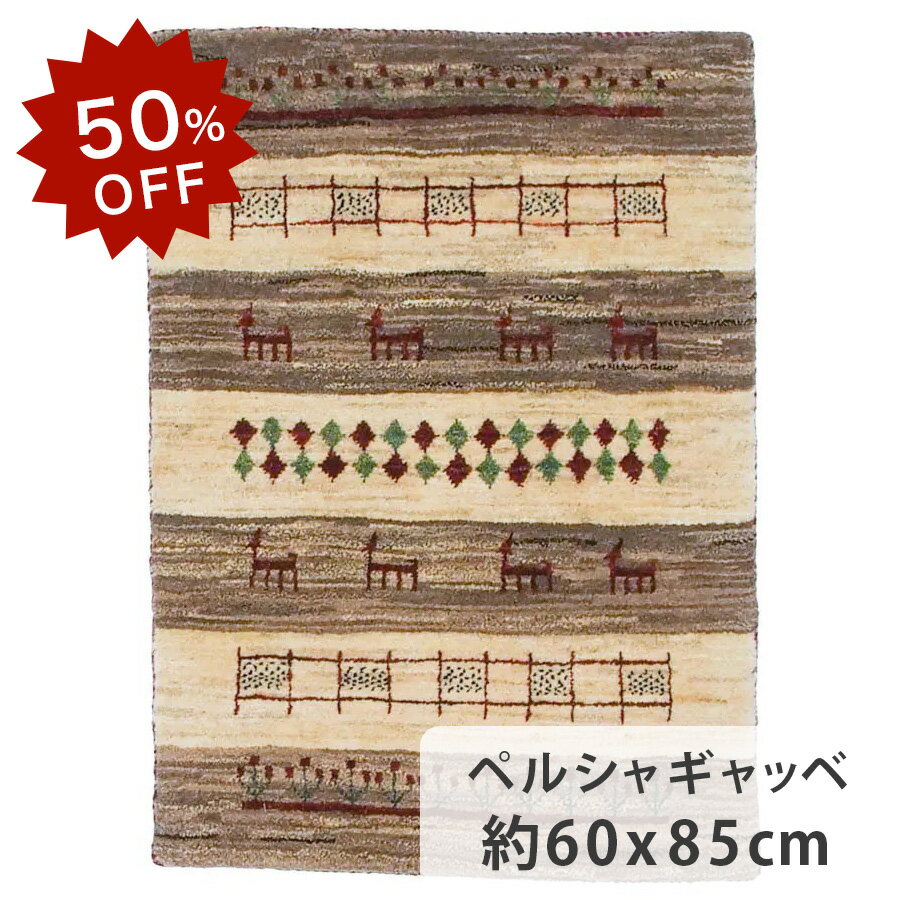 【50%OFF!楽天スーパーSALE限定!】ペルシャギャッベ ファインクオリティ 約60cm x 85cm 玄関サイズ ナチュラル ウール100% 羊毛 天然 ふかふか モコモコ ベージュ ブラウン ボーダー柄 縞模様 動物 ヤギ 花壇 花 ホットカーペット対応 床暖房対応 オールシーズン 手織り