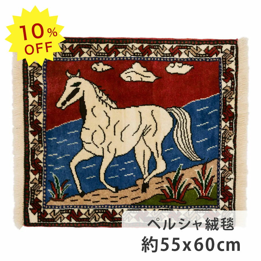【10%OFF!楽天スーパーSALE限定!】ペルシャ絨毯 ヤラメ 約55cm x 60cm 赤色 青色 レッド ブルー 正方形 幾何学模様 羊毛 ウール 空 雲 川 馬 ホース ホットカーペット対応 床暖房対応 室内 オールシーズン 一年中 現品限り 一点もの 高級 北欧 絨毯 ラグ 夏
