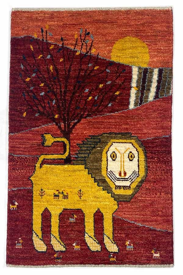 【10%OFF!楽天スーパーSALE限定!】ペルシャギャッベ ライオン ファインクオリティ 約61cm x 96cm ギャッベ ラグ 赤 ウール100% 玄関マット 羊毛 自然 太陽 木 鹿 動物 ユニーク カラフル モコモコ ふかふか オールシーズン 床暖房対応 ホットカーペット対応 厚手 現品限り