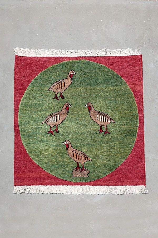 【10%OFF!楽天スーパーSALE限定!】ペルシャギャッベ ファインクオリティ 約93cm x 97cm レッド グリーン 赤色 緑色 ウール100% 羊毛 天然 ふかふか モコモコ キリム 平織り ヤマウズラ 鳥 ホットカーペット対応 床暖房対応 オールシーズン 現品限り ペルシャ製