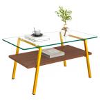 センターテーブル ガラステーブル 幅87.6cm 強化ガラス ローテーブル 収納付き コーヒーテーブル 2段収納 MDF 北欧モダン リビングテーブル ゴールド脚 長方形