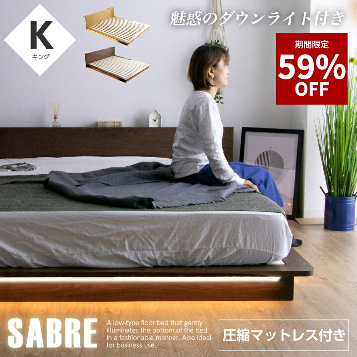 【59%OFF★12月4日20時〜11日2時迄】ベッド キングベッド キング ベッドフレーム 圧縮マットレス付き LED照明付き ダウンライト フロアベッド ローベッド 木製 ベット