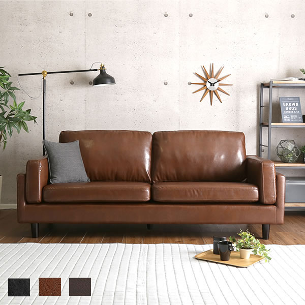 ヴィンテージ ソファ 3人掛け レザー 合皮 おしゃれ ヴィンテージ風 3Pソファー ローソファ レザーソファー ブルックリンスタイル 幅188cm 奥行75cm 高さ73cm 座面高さ35.5cm ココナッツブラウン ブラック 黒 ダークブラウン 茶色 天然木の脚 リビング レトロ調 お手入れ簡単
