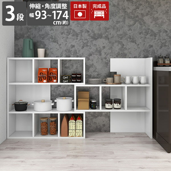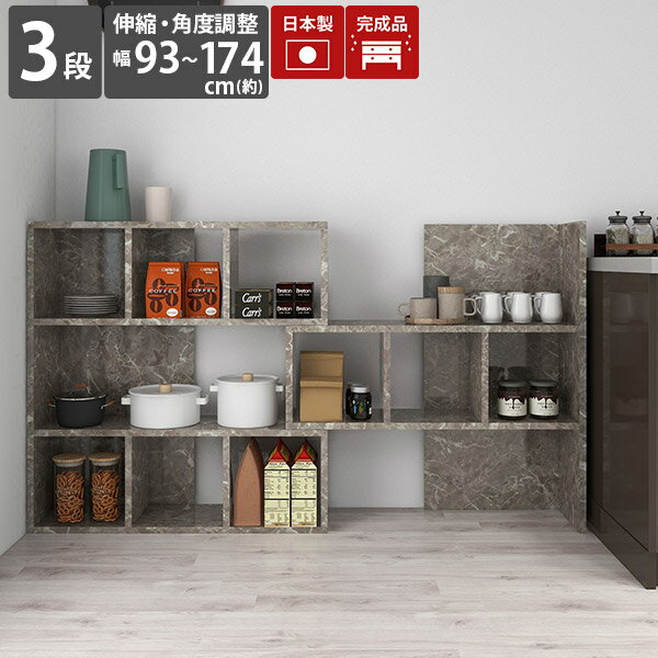オープンラック 3段 ディスプレイラック 横長 キッチンラック 伸縮 ラック 本棚 キッチン 大理石風 鏡面 飾り棚 リビング収納 国産 シェルフ 伸縮ラック ディスプレイ 棚 キッチン収納棚 オープンシェルフ 北欧 伸縮棚 グレー コーナーラック 完成品 おしゃれ 【R+R90-3】 ☆