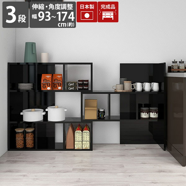 コーナーラック おしゃれ オープンラック 3段 奥行30cm キッチンラック 伸縮 ラック キッチン 黒 伸縮ラック ディスプレイラック ブラック 3段ラック 横長 鏡面 リビング収納 オープンシェルフ 北欧 シェルフ 飾り棚 完成品 薄型 ディスプレイ キッチン収納棚 【R+R90-3】 ☆