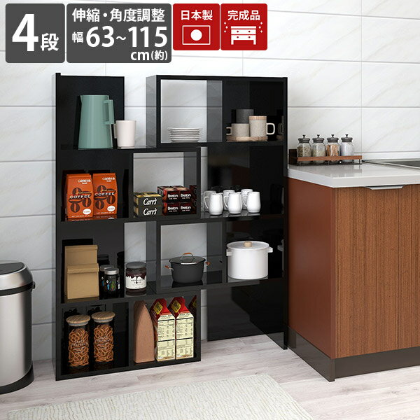 シェルフ 黒 オープンラック ブラック 本棚 4段 A4サイズ ディスプレイ 棚 ラック リビング収納 ディスプレイラック 完成品 待合室 本 仕切り棚 和 モダン リビング 書斎 4段ラック 奥行30cm オシャレ 飾り棚 コーナーラック 大容量 伸縮 収納 鏡面 日本製 black R+R60-4 ☆