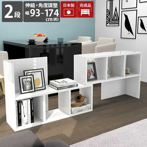 リビング収納 モダン ディスプレイラック 小型 横長 ホワイト 白 本棚 完成品 伸縮ラック 間仕切り 収納 コーナーラック 棚 高級感 おしゃれ 鏡面 オープンラック 低め 2段 扉付き 伸縮棚 低い A4 扉付 キャビネット 日本製 北欧 書斎 組み立て不要 仕切り 【R+R-DX60-2】 ☆