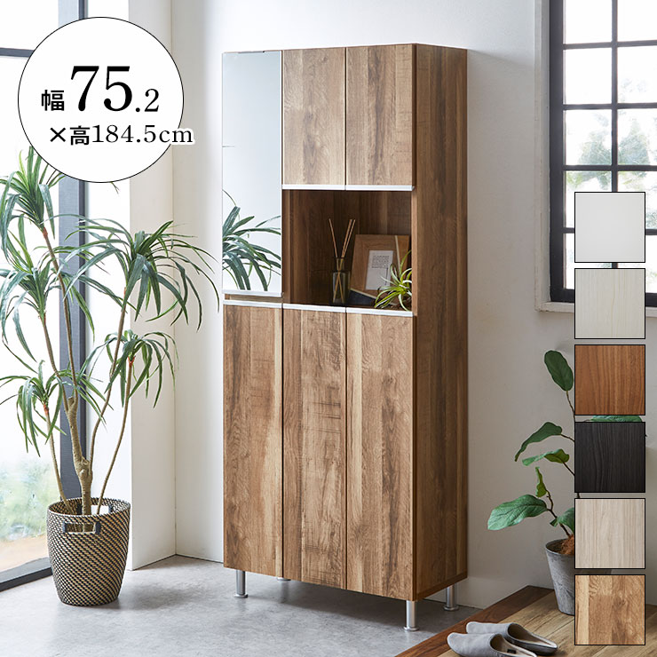 【全商品に使える10%offクーポンあり!!】 国産 靴箱 下駄箱 幅75cm シューズボックス 全身鏡付き ミラー付き 木製 木目柄 日本製 おしゃれ シンプル モダン シューズラック ハイタイプ 洗える棚板 可動棚 アジャスター付き 脚付き 玄関収納 リビング収納