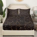 【並行輸入品】星座テーマ ボックスシーツ クイーンサイズ ブラックとゴールド 寝具セット 星空 ギャラクシー シーツセット、星と月 ベッドカバー