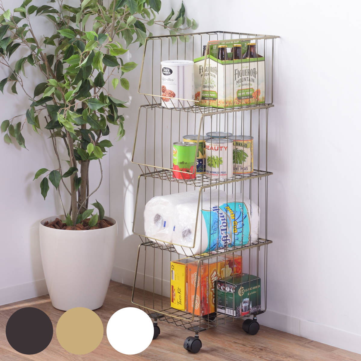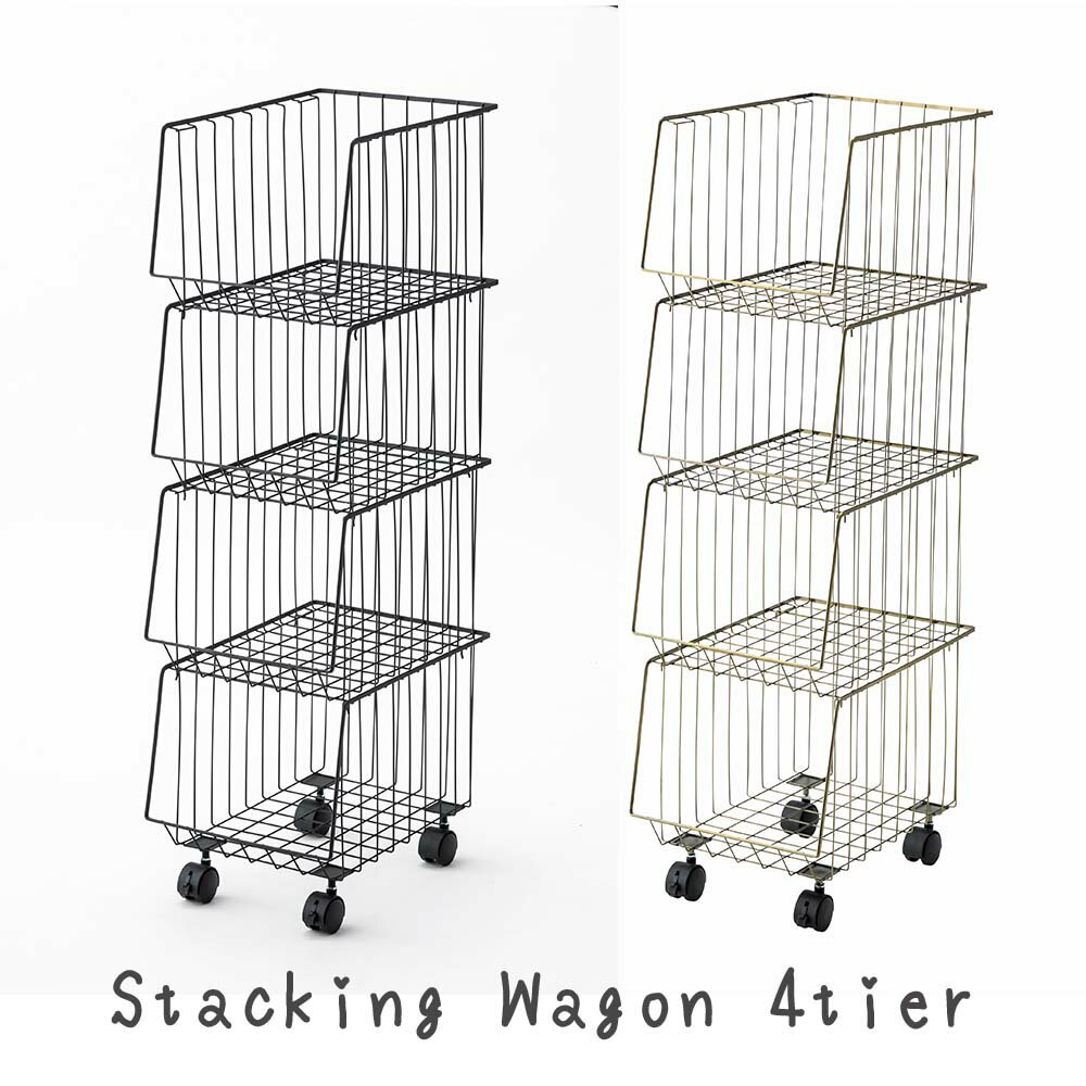 スタッキングワゴン4段 キッチンワゴン 収納ワゴン バスケット バスケットワゴン ブラックゴールド 黒 金色 キッチン収納ワゴン キッチン収納 キッチンラック キッチンストッカー ランドリーワゴン ランドリー収納 ラック オープンラック 収納棚
