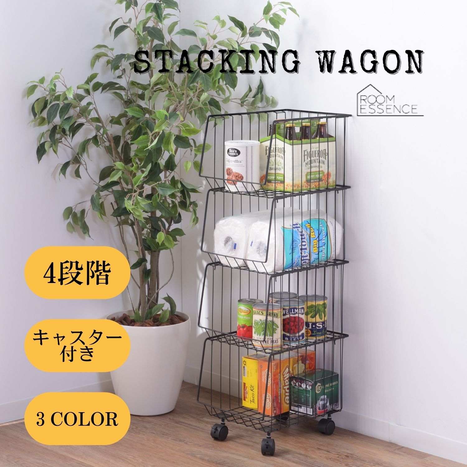 スタッキングワゴン3D AKB-438 キャスター付き 3段 4段 シンプル コンパクト キッチン 台所 洗面所 書類 雑誌 雑貨 食品 店舗 陳列 ディスプレイ ランドリー ROOM ESSENCE 東谷 オシャレ 部屋収納