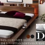 フロア ダブル ベッド 国産カバー ポケットコイル マットレス セット ローベッド 2灯 ライト コンセント 宮 棚 幅広フレーム マット ベッドセット 寝具 送料無料