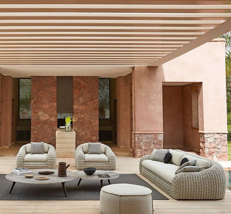 屋外の別荘の庭のソファと椅子レジャーの屋外の防水の日焼け防止のロープ織ソファハイエンドの岩板のテーブルと椅子のカバー
