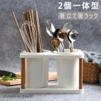 箸立て箸ラック スタンド付き 白陶器 木製 キッチン食器収納排水穴 カトラリースタンド 水切り 2個一体型 かわいいホームキッチンダイニングテーブル おしゃれ