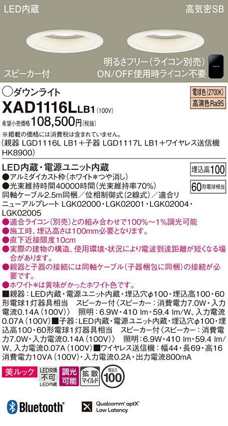 パナソニック「XAD3116LLB1」(親LGD3116LLB1子LGD3117LLB1送信機HK8900)LEDダウンライトスピーカー付きセット【電球色】埋込穴100パイ<拡散/LED交換不可><調光可・ライコン別売/【要工事】LED照明■■