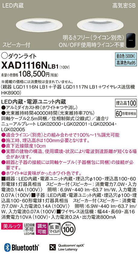 XAD1116NLB1 パナソニック LEDダウンライト スピーカー付 明るさフリー ライコン別売 昼白色 埋込高100 60形電球相当 調光可能 拡散マイルド 埋込φ100