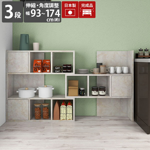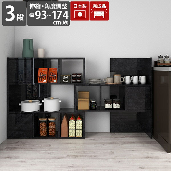 オープンラック キッチンラック 伸縮 ラック キッチン 3段 スライド 本棚 扉付き コーナーラック 大理石風 黒 ディスプレイラック ブラック 高級感 鏡面 横長 キッチン棚 扉付 A4 完成品 伸縮ラック オープンシェルフ 北欧 キッチン収納棚 おしゃれ 日本製 【R+R-DX90-3】 ☆