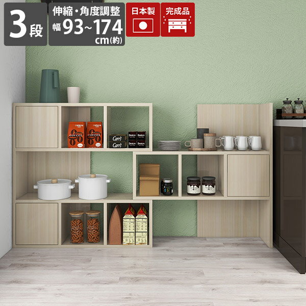 伸縮ラック 収納棚 オープンラック ラック キッチン ホワイト 完成品 3段 キッチンラック 伸縮 鏡面 白 キッチン収納棚 ディスプレイ 収納 シェルフ キッチン棚 扉付 リビング収納 ディスプレイラック 横長 木目 扉付き おしゃれ コーナーラック 日本製 【R+R-DX90-3】 ☆