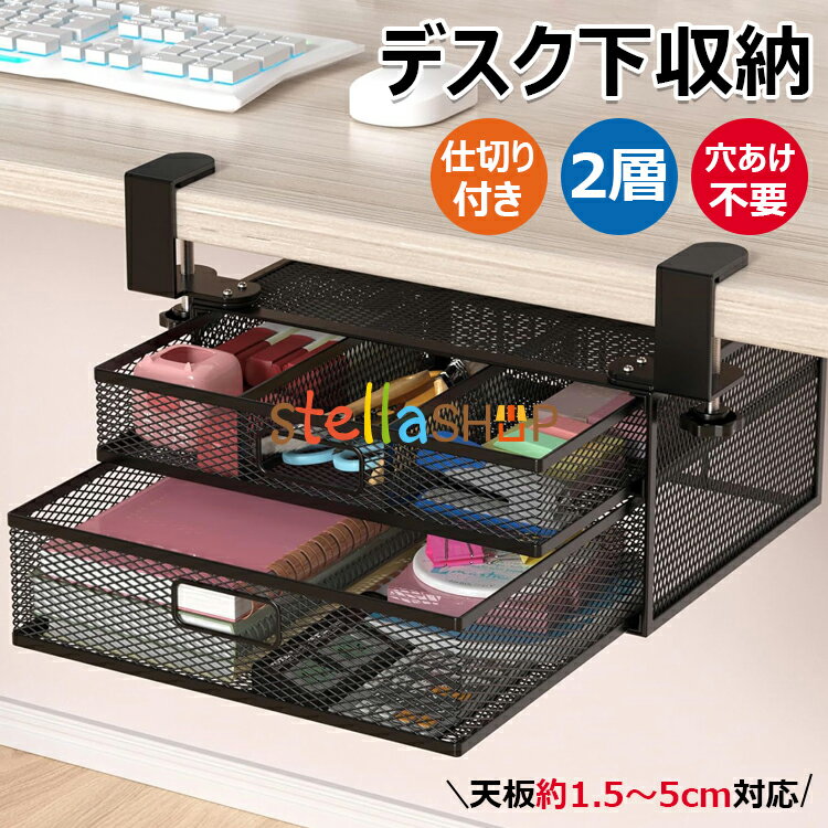 【6%OFFクーポン】【穴あけ不要 & 2層の引き出し】デスク下 収納 ラック デスク 収納 スチール製 収納整理仕切り付き 引き出し 後付け テーブル下収納 文房具 収納 卓上 収納 小物ボックス 便利 机下収納 小物整理 事務用品 食器収納 天板1.5〜5cm設置可能/簡単な取り付け