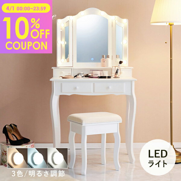 ドレッサー 化粧台 おしゃれ 収納 デスク 白 LEDライト ドレッサーデスク 鏡台 スツール付き セット 2way 一人暮らし コンセント モア
