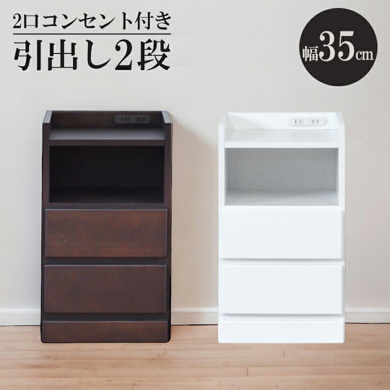 【全商品に使える10%offクーポンあり!!】 ナイトテーブル 2段 ローチェスト 幅35cm スリムチェスト 白 白家具 引き出し収納 隙間収納 ホワイト ブラウン コンセント付き ベッドサイド ソファサイド コンパクト 引出し収納 引出し リビングチェスト