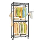 SONGMICS ハンガーラック 洋服かけスチールラック 2段式衣装収納 幅75cm 耐荷重122kg 調整な棚とポール 3つ棚有り フック、キ