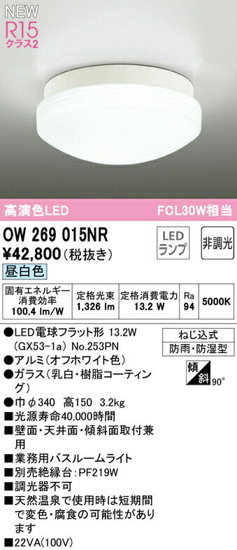 OW269015NRLED業務用バスルームライト 浴室灯 FCL30W相当R15高演色 クラス2 昼白色 非調光オーデリック 照明器具 防雨・防湿型 天井付・壁付け兼用 シーリング
