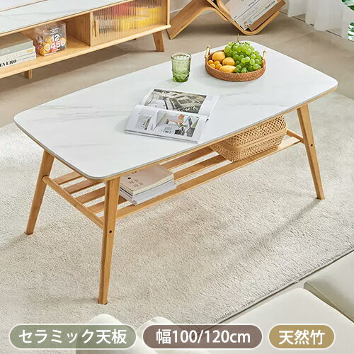 7%OFFクーポン★11/29~30 センターテーブル ローテーブル 幅100cm 120cm セラミックテーブル 棚板付き ミニテーブル 座卓 置き台 机 リビングテーブル オープン収納 ナチュラル ホワイト 天然竹 セラミック天板 お手入れ簡単