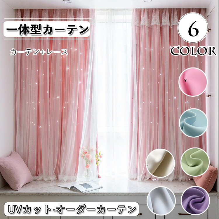 カーテン 遮光 レース おしゃれ オーダー 一体型 レースカーテン レース ベージュ グレー パープル ピンク ブルー グリーン UVカット 遮像 出窓 シンプル 無地 お姫様 ベッドルーム リビング 一体型カーテン 透かし彫り星柄