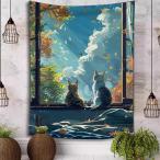 タペストリー 壁掛け 壁飾り インテリア ファブリックポスター おしゃれ 部屋飾り 背景布 目隠し 寝室 カーテン 窓辺から外を眺める猫の絵柄 幅70cmx縦100cm