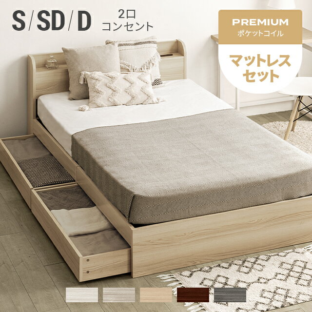 棚付きベッド すのこベッド 厚さ20cmポケットコイルマットレスセット シングル 木製 コンセント ベッド おしゃれ すのこベッド