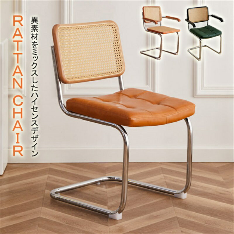 【全商品3%OFF】CAGUUU ラタン調木製ダイニングチェア ラタンチェア おしゃれ 椅子 北欧風 イス デスクチェア 籐製背もたれ PUレザー座面 高弾性クッション スチール脚 在宅ワーク インテリア家具 コンパクトチェア リビング用椅子 カフェ風 レトロ調