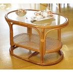 ラタンテーブル 楕円形 ガラス天板 ローテーブル 棚付 籐家具 幅75cm