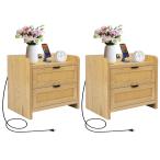 【並行輸入品】Walsham ナイトスタンドセット2、充電ステーション付きラタンナイトスタンド、引き出し付きモダンなエンドテーブル、ベッドサイド