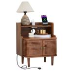 【並行輸入品】充電ステーション付き金属製ラタンエンドテーブル、ミッドセンチュリーモダンナイトスタンド、2ドア付き、ベッドサイドテーブル、ソファ、