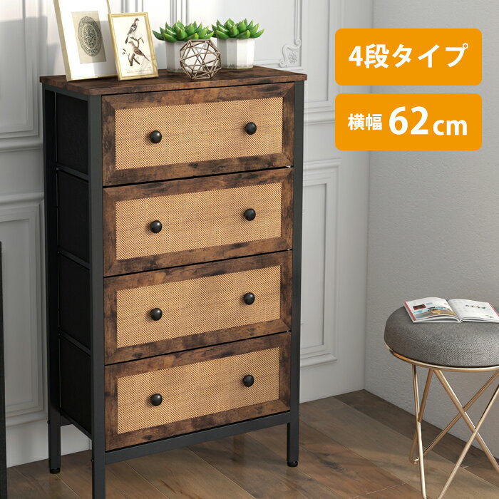 [☆10%offクーポン発行中☆1/17.18限定!!] チェスト 4段 幅62 ラタン風 ボックス 天板にも置ける 木製取っ手 スチールフレーム アジャスター付き シンプル