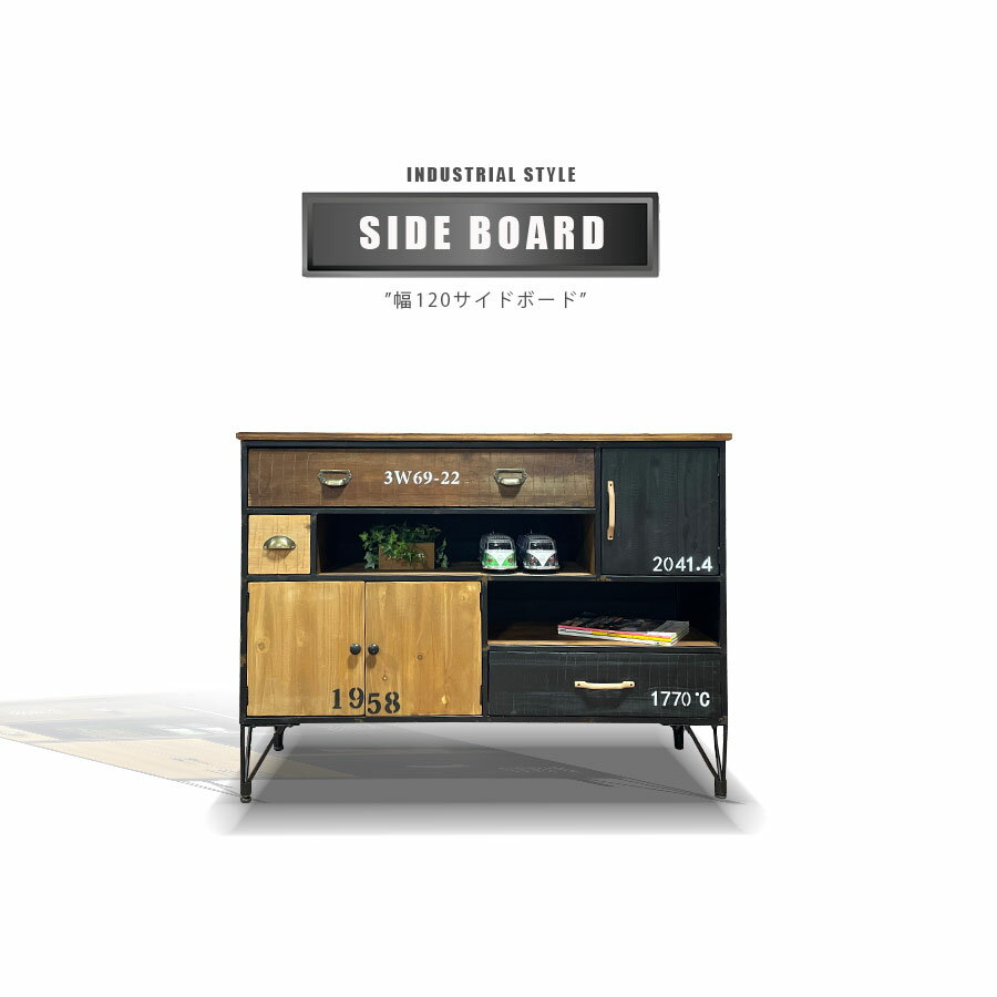 今だけ10%offクーポン サイドボード 幅120 キャビネット おしゃれ ヴィンテージ風 インダストリアル リビングボード 脚付き 引き出し オープンボード 古民家風 カフェ風 レトロ ダメージ加工 扉 収納 リビング収納 インスタ映え