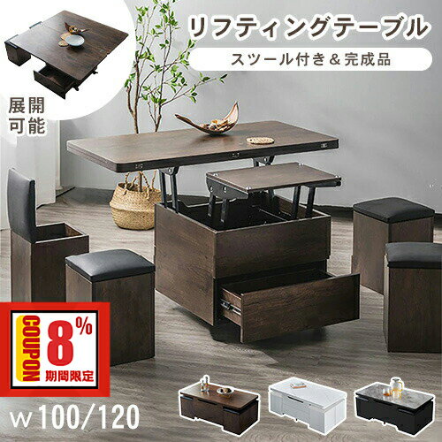 10%OFF期間限定★リフティングテーブル 昇降テーブル センターテーブル リフトアップテーブル 幅100 120cm スツール4個付 ローテーブル 完成品