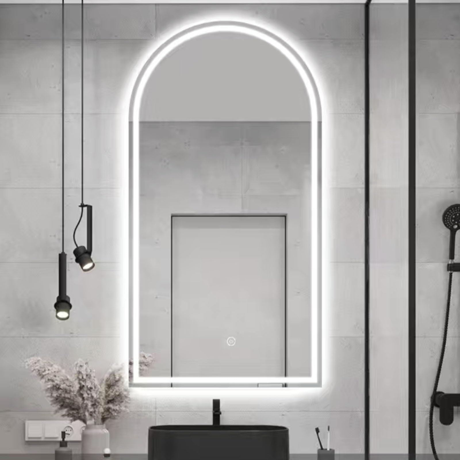アーチ型LEDバスルームミラー、3色のライト付きフレームレスウォールミラー、ベッドルームバニティミラー、リビングルーム装飾ミラー、無段階調光可能、