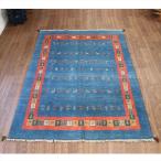 ギャッベ 明るいブルー 233x172cm 動物と駱駝のモチーフ レッドボーダー