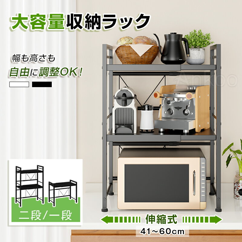 レビューで12%OFFクーポン★新作 伸縮 レンジラック レンジ台 2段 1段 スライド棚 幅41-60cm レンジ レンジボード キッチン収納 オープンラック スリム キッチンボード トースター 炊飯器 電子レンジラック レンジ台 おしゃれ キッチンラック 省スペース 2色 収納家具