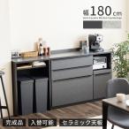 キッチンカウンター 180幅 完成品 石目調 セラミック 天板 レンジ台 おしゃれ ブラック グレー 黒 灰 奥行42cm コンセント付き 引き出し スライドカウンター