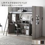 L字デスク付きロフトベッド+マットレス セット ベッド幅104cm シングル ベッド 薄型4cm厚マットレス デスク 木製 ロフトベッド システムベッド ハイタイプ ...