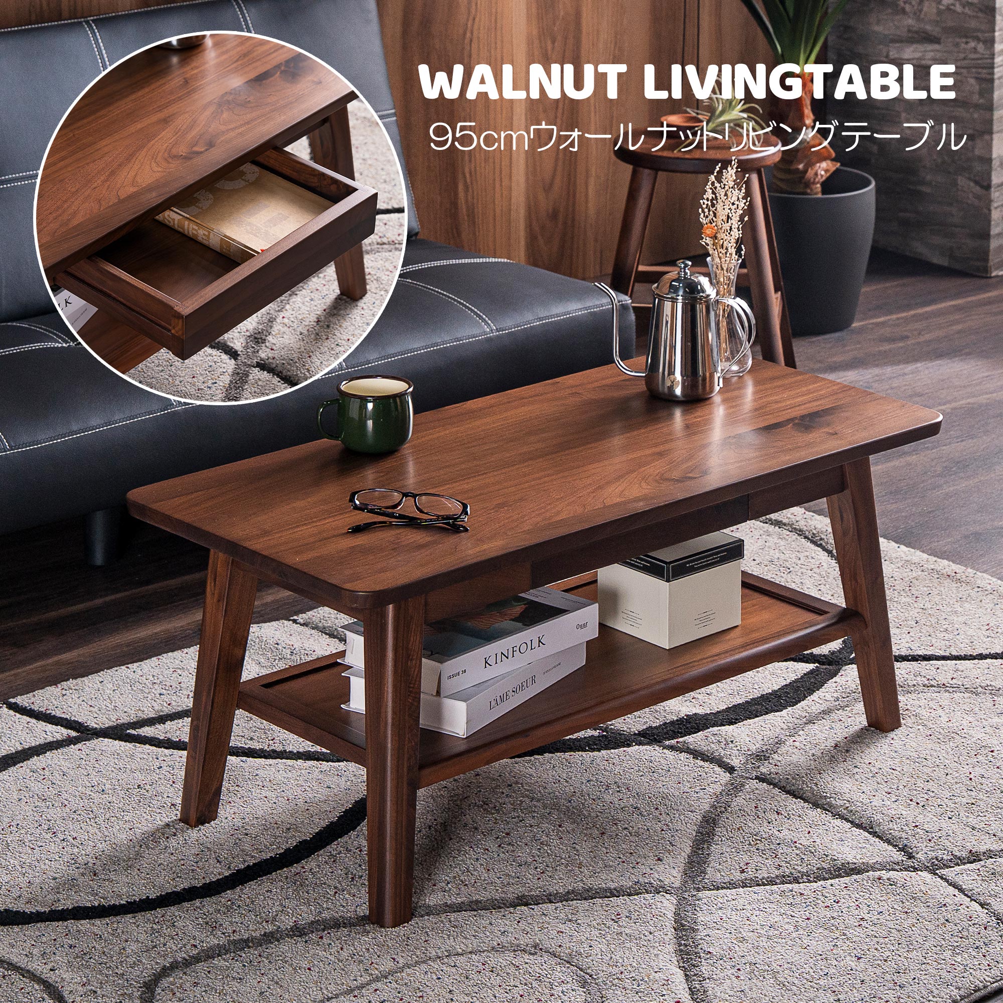 センターテーブル 95cm 収納 引き出し付き リビングテーブル ウォールナット 北欧 木製 おしゃれ リビングテーブル 棚付き