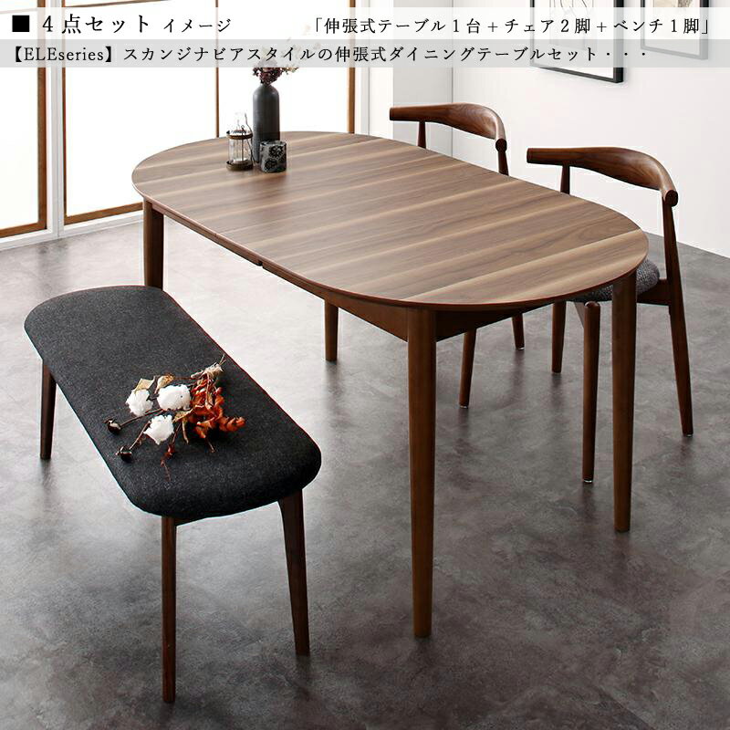 クーポン祭り開催中!商品名| JSR 伸縮式ダイニング4点セット材 料| ウォールナット突板/布張り北欧テイスト ウレタン塗装 ベンチ 伸張式テーブル【セット内容】伸縮式テーブル ×1台チェア ×2脚ベンチ ×1脚