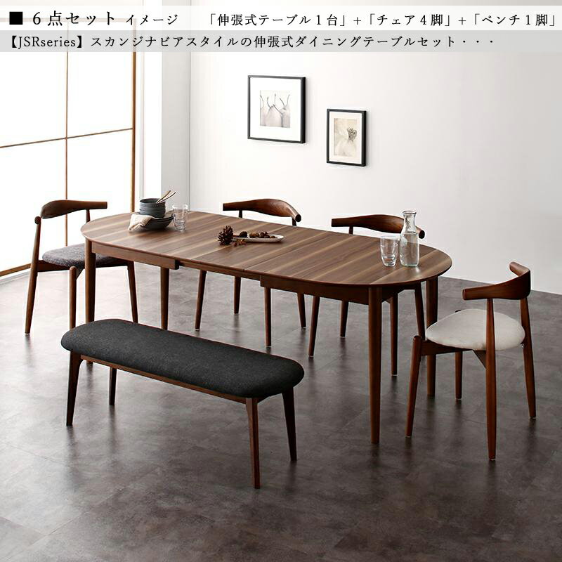 クーポン祭り開催中!商品名| JSR 伸縮式ダイニング6点セット材 料| ウォールナット突板/布張り北欧テイスト ウレタン塗装 ベンチ 伸張式テーブル【セット内容】伸縮式テーブル ×1台チェア ×4脚ベンチ ×1脚