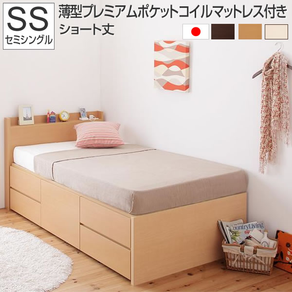 お客様組立 収納ベッド セミシングル ショート丈 収納ベット 収納付き ベッド 宮付き コンセント付き 引出し付き 一人暮らし 子供ベッド ベット オシャレ 木製 フレーム日本製 ベッドの下 収納 ホコリ防止 薄型プレミアムポケットコイルマットレス付き セミシングルベッド
