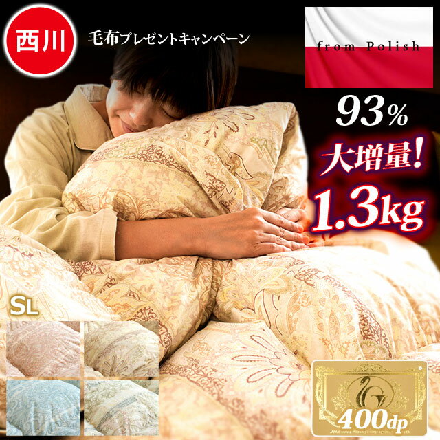 【30日20時〜2H限定10%OFFクーポン】大増量1.3kgタイプ★西川 毛布プレゼント(ハーフケット) 羽毛布団 ★ポーランド産 ダウン93% 【7年保証】ロイヤルゴールド ダウンパワー400dp以上 日本製 シングル 羽毛ふとん 羽毛掛け布団 ロング ピーチスキン加工