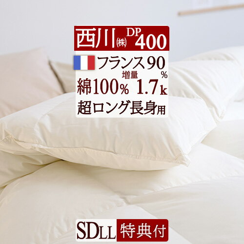 12/1限定★11%OFFクーポン 羽毛布団 セミダブル ロング 長身用 西川 【掛布団カバー等特典付】フランス産ホワイトダウン90% 大増量1.7kg 【掛布団カバー等特典付】コインランドリー対応 DP400 羽毛ふとん 日本製 抗菌 羽毛掛け布団 掛布団